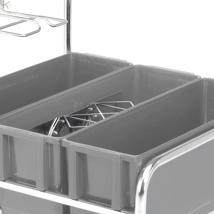 - Polished stainless steel trolley with plastic buckets