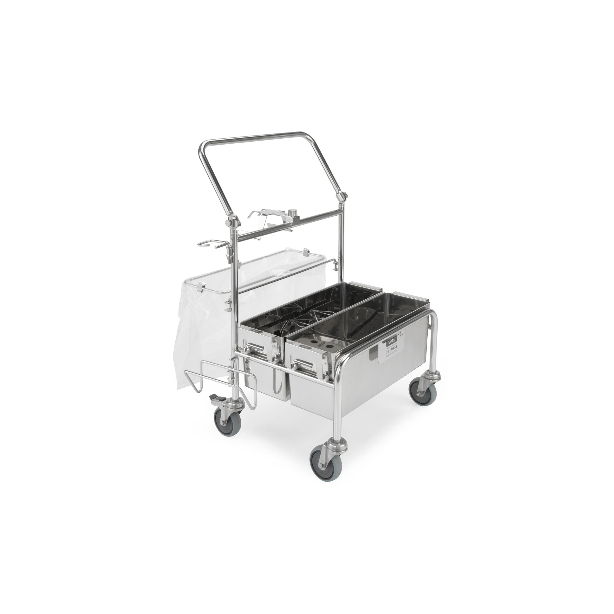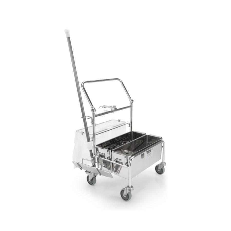 The 2.0 ERGO-S is a unique, touchless cleanroom cleaning system of the second generation made of high quality stainless steel. In combination with user-friendly accessories and a selection of our PurMop® disposable or reusable mops this system combines ergonomic handling with a durable, cleanroom suitable design. The intelligent ERGO cleanroom cleaning trolleys set the highest standards of cleanroom cleaning. The innovative mop wetting device guarantees reproducible results and avoids excess fluid. The intelligent mop discarding mechanism enables a hands-free discarding of used mops.