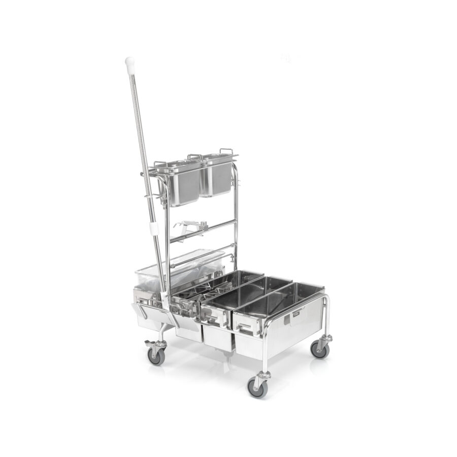 The 2.0 ERGO-S is a unique, touchless cleanroom cleaning system of the second generation made of high quality stainless steel. In combination with user-friendly accessories and a selection of our PurMop® disposable or reusable mops this system combines ergonomic handling with a durable, cleanroom suitable design. The intelligent ERGO cleanroom cleaning trolleys set the highest standards of cleanroom cleaning. The innovative mop wetting device guarantees reproducible results and avoids excess fluid. The intelligent mop discarding mechanism enables a hands-free discarding of used mops.