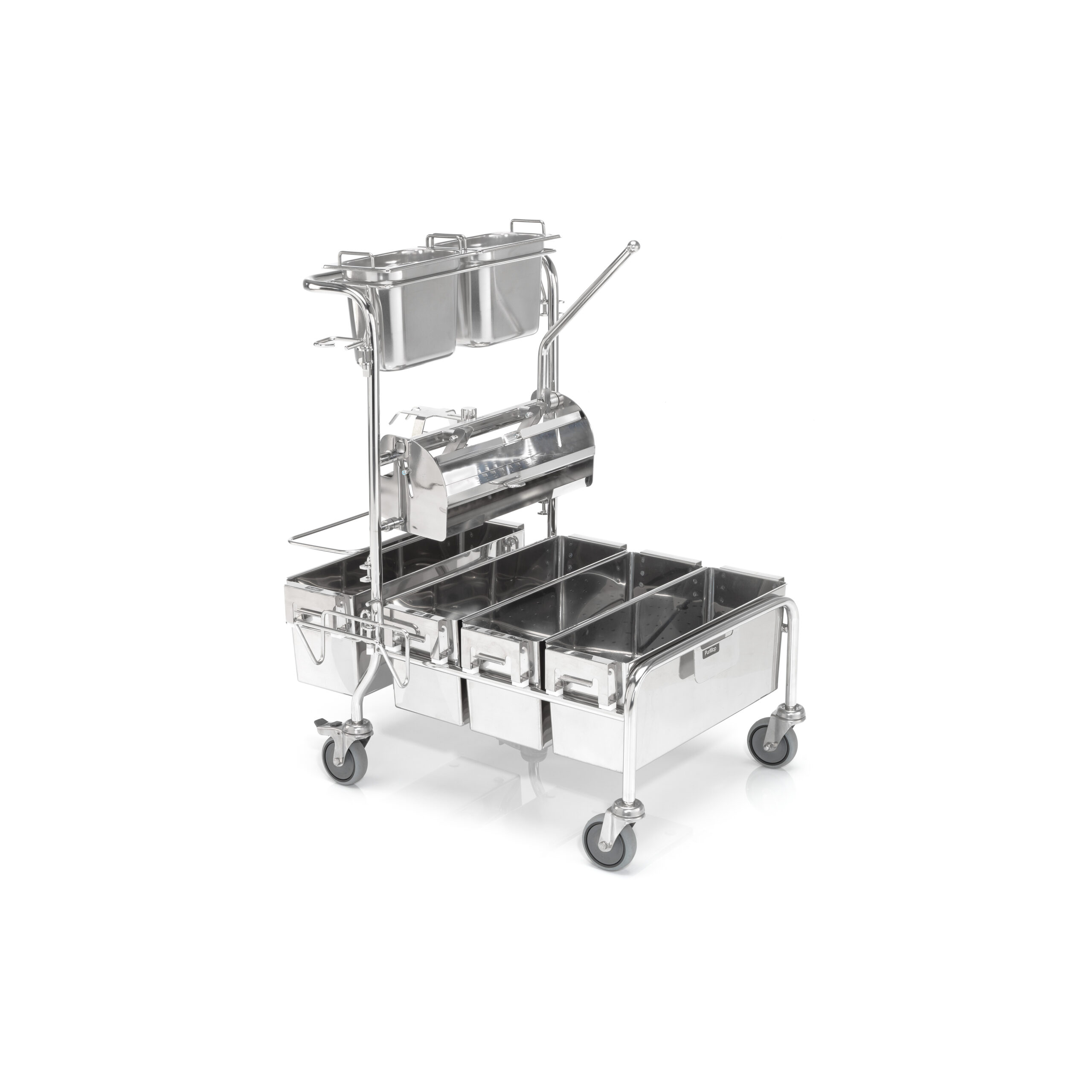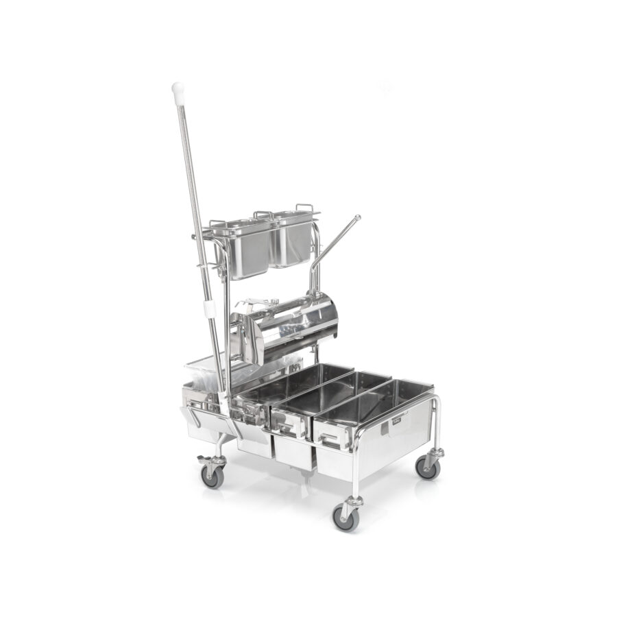 The 2.0 TRIO-S trolley series is an ergonomic stainless steel cleaning trolley system with wringer. It has up to 3 stainless steel buckets at the front. It includes a mop discarding system and a mop handle holder. The PurMop® wringer has been developed for use in cleanrooms and is made of polished stainless steel. The innovative function of the wringer enables improved reproducibility by means of a defined wringing pressure and reduced user effort thanks to the force transmission mechanism.