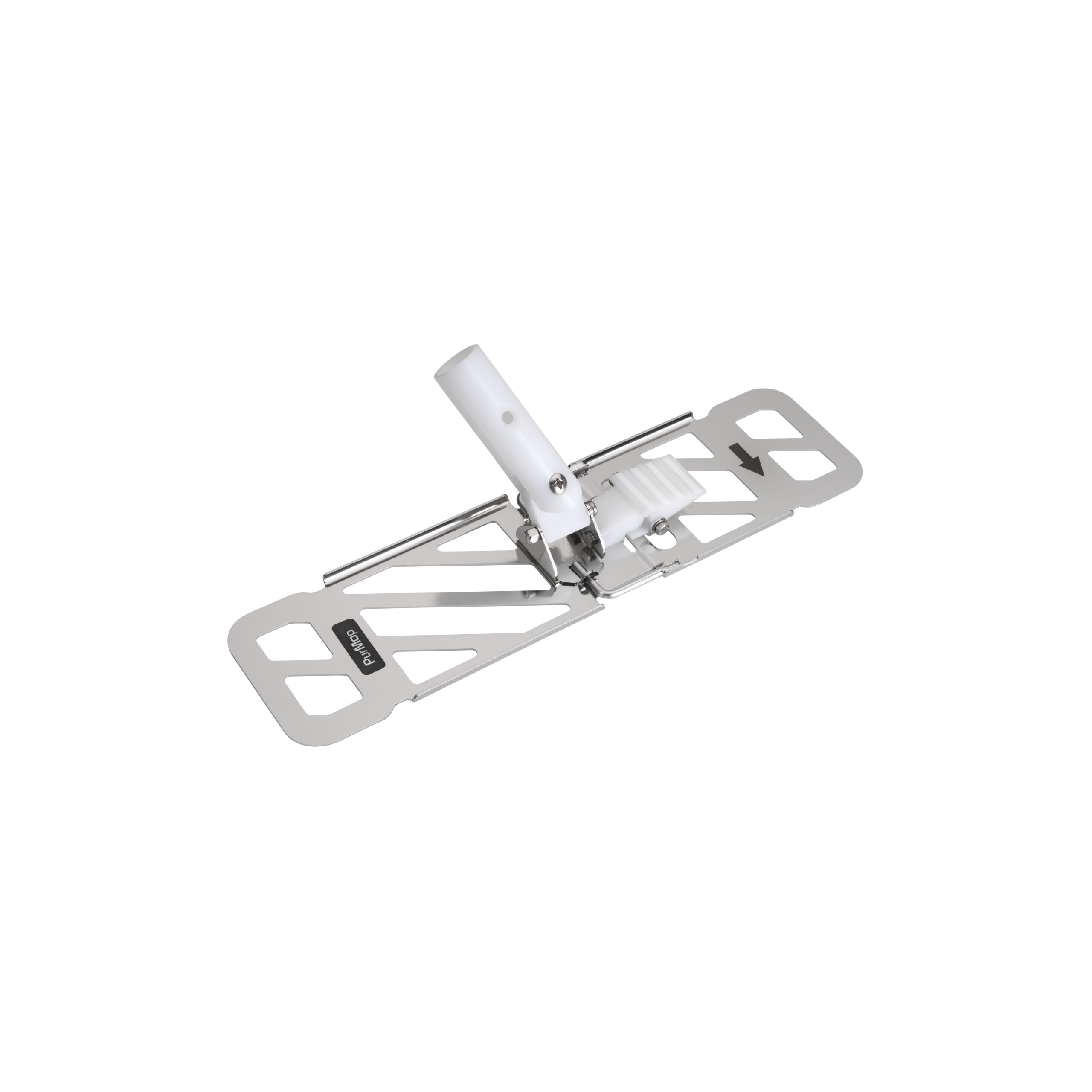 PurMop® KEK40 Light is a folding stainless steel mop frame with a number of clever features. The special design without wireframe guarantees an easy cleanability, while the ultra flat design ensures a touchless pickup of mops. The mop frame can be opened with the foot or with the mop discarding mechanism on the trolley and can be fixed for ceiling cleaning with a special locking button. The new design of the KEK40 Light ensures reduced weight for ergonomic cleaning especially for walls and ceilings.