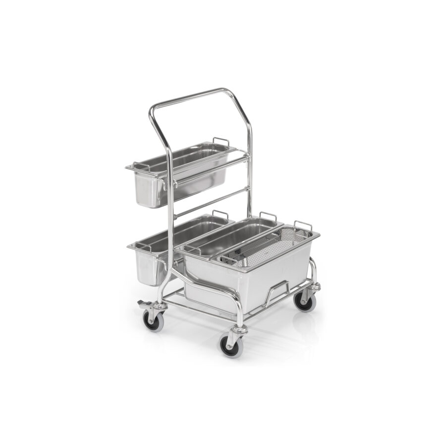 The PREPARE stainless steel system is an ultra-compact and mobile cleaning system for the presaturation of mops and has a 2-bucket concept. By pouring the cleaning / disinfectant fluid over the mops before usage, these can be easily and safely presaturated (before use in the cleanroom). One bucket serves as pickup of the fresh mops, the other is used for discarding the used mops. Thanks to its compact dimensions and its high-quality stainless steel design, the presaturation system is easy to clean and autoclavable.