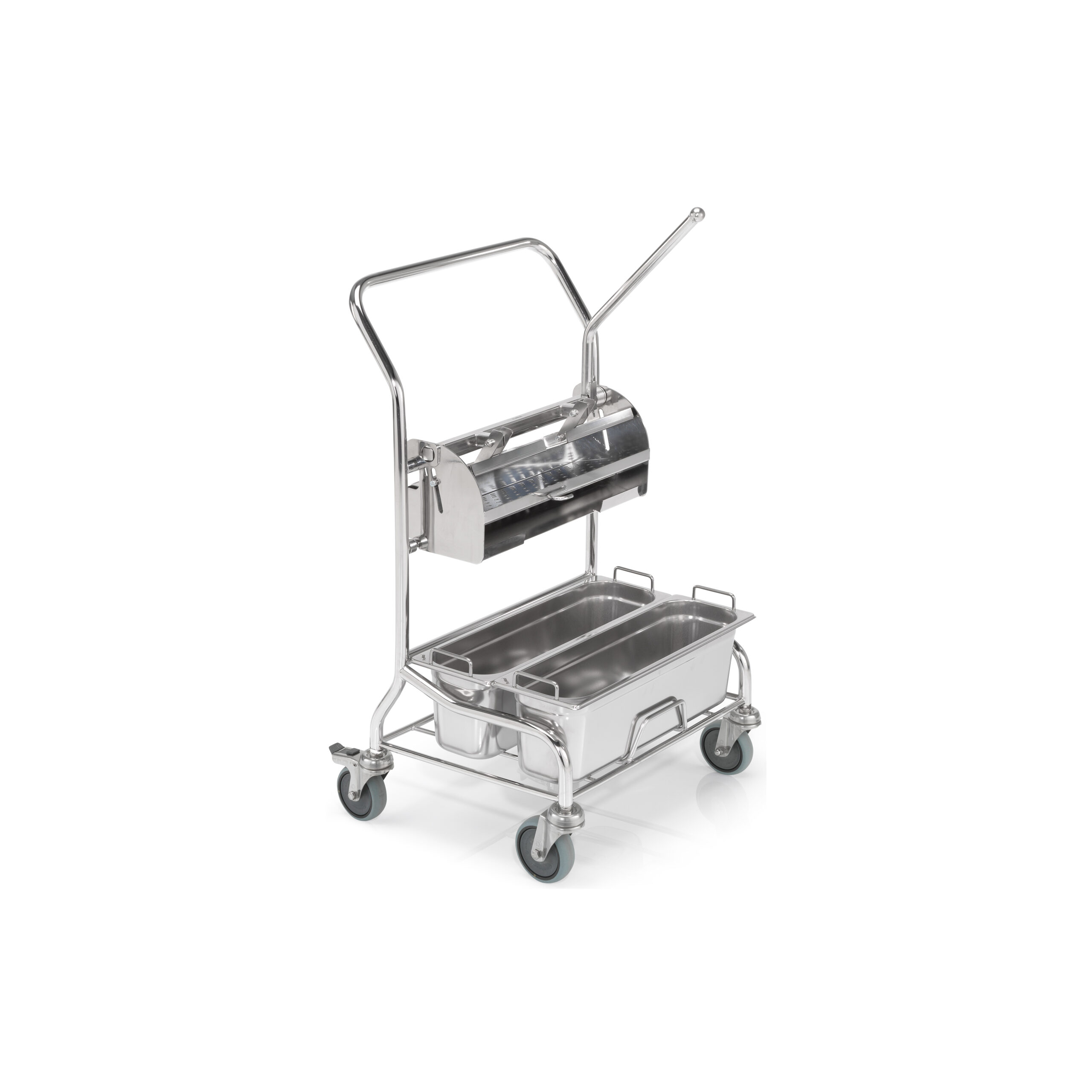The UNO/DUO trolley series are stainless steel cleaning trolley systems with wringer. The PurMop® wringer has been developed for use in cleanrooms and is made of polished stainless steel. The innovative function of the wringer enables improved reproducibility by means of a defined wringing pressure and reduced user effort thanks to the force transmission mechanism.