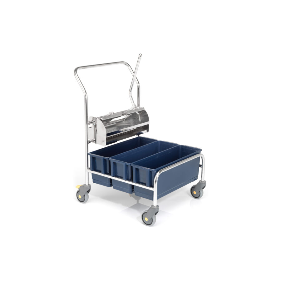 Die 1.0 TRIO Wagenserie ist ein ergonomisches Reinigungswagensystem mit Presse. Er verfügt über bis zu 3 Kunststoffeimer an der Vorderseite. Die PurMop® Presse wurde für den Einsatz in Reinräumen entwickelt und ist aus poliertem Edelstahl gefertigt. Die innovative Funktion der Presse ermöglicht eine verbesserte