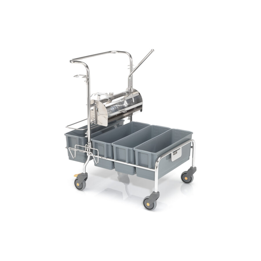 - Material: Gestell aus Edelstahl 1.4301 / AISI 304, poliert | PP Kunststoffwannen | Rollen aus thermoplastischem Polyurethan